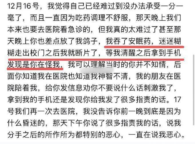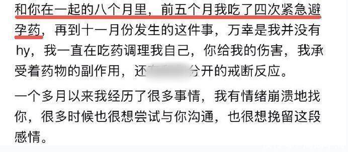 据她所说,恋爱初期感情还算稳定,但短短5个月内,她就服用了4次避孕药。为了调理身体,她开始节食、喝中药,身体状态一度非常差。可男方不仅没有丝毫体谅,还在她最焦虑的那段时间,竟然还和其他女生通宵玩“剧本杀”,全然不顾她的情绪。